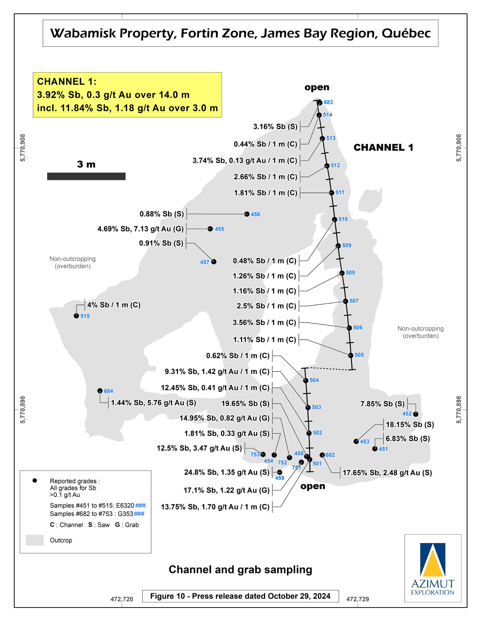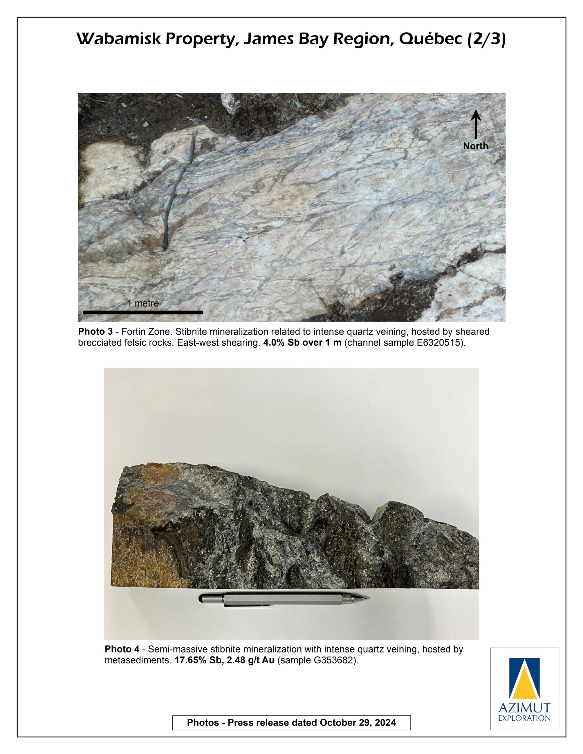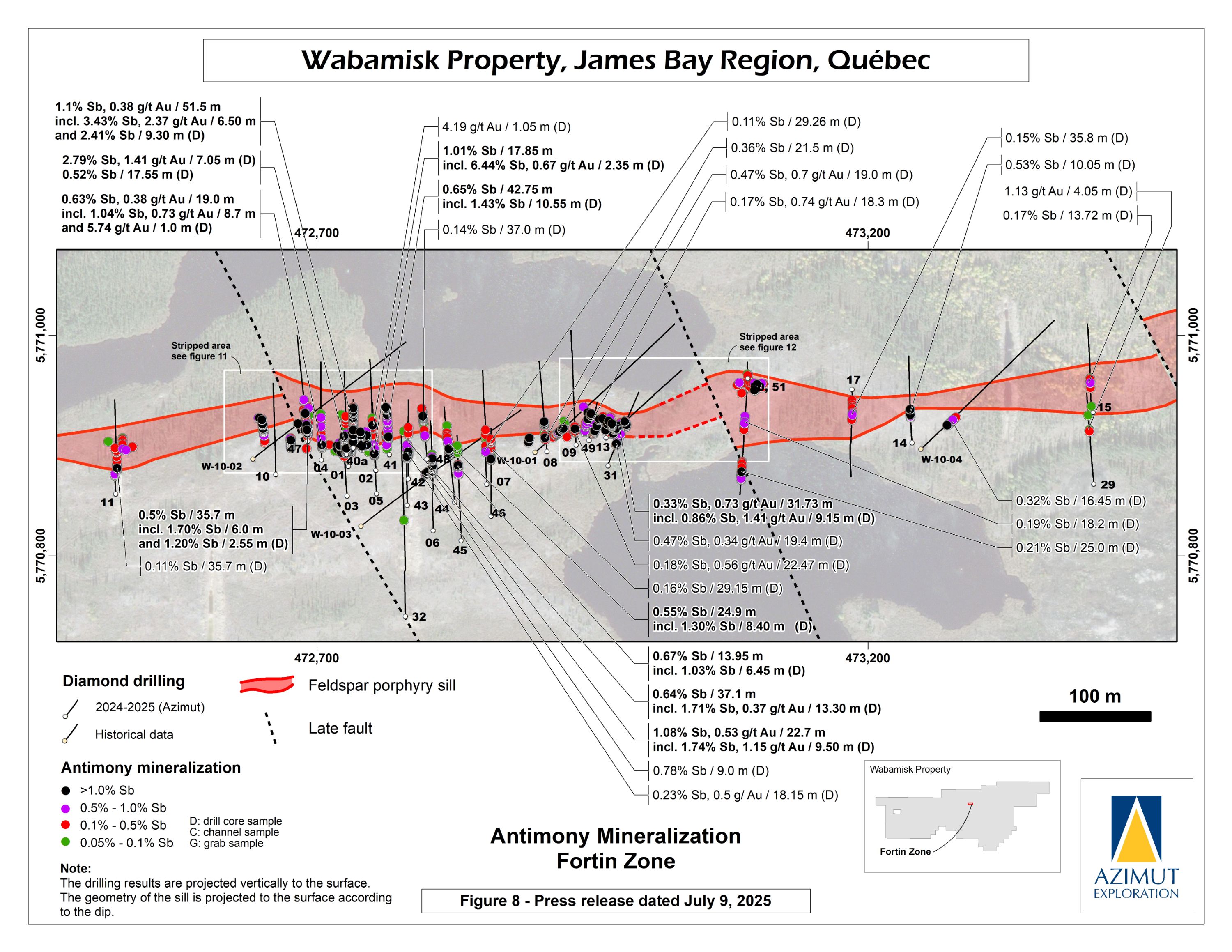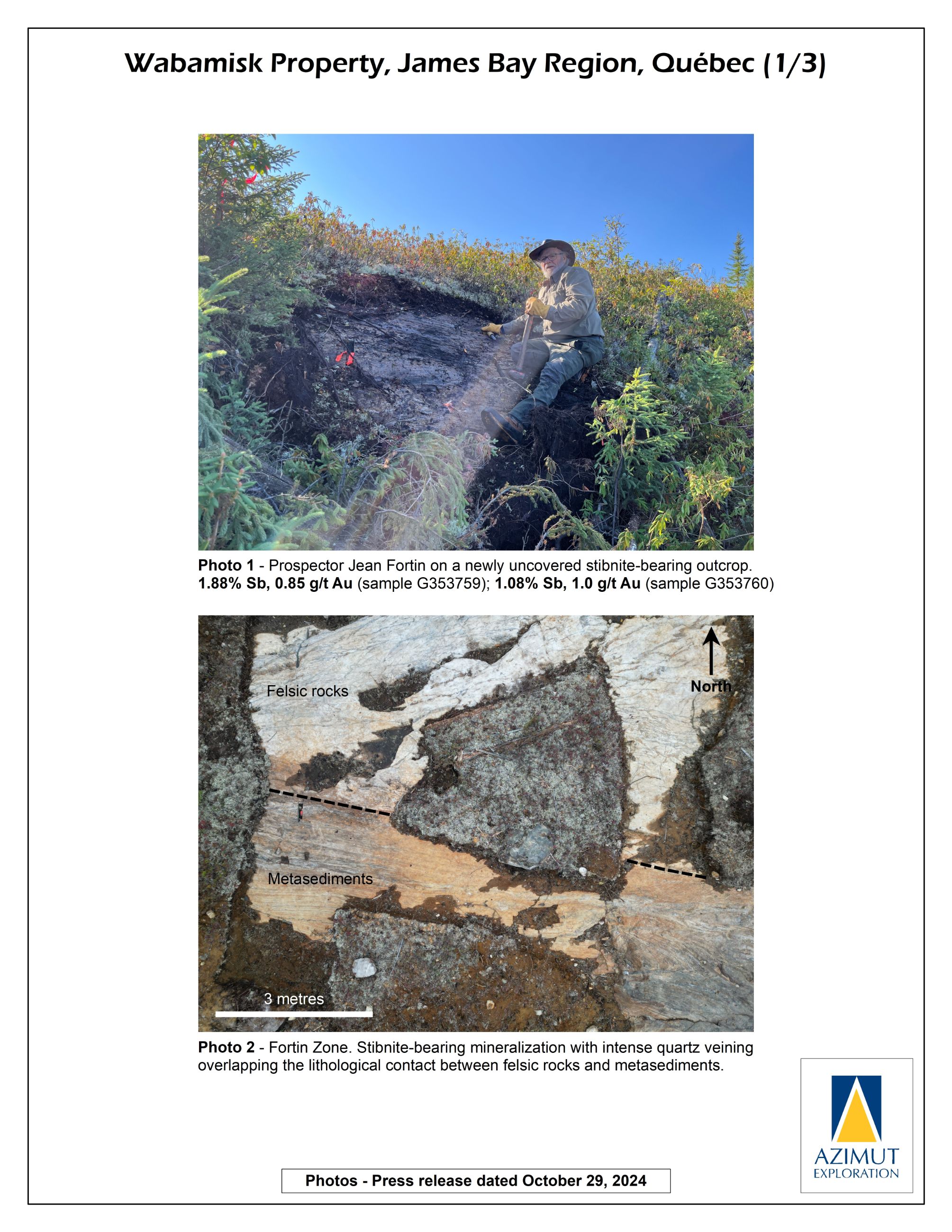 In October 2024, Azimut announced the discovery of a high-grade antimony corridor on the property with channel samples (3.92% Sb over 14.0 m) and numerous high-grade grab samples (up to 24.8% Sb) collected along a 1.2-kilometre-long strike within the Fortin Zone. Gold (up to 7.27 g/t Au in grabs) commonly accompanies antimony. Note that grab samples are selective by nature and unlikely to represent average grades. Geoscientific data (prospecting, induced polarization and magnetism, lake sediment, till and soil geochemistry) support a minimum 3.5-kilometre length for the antimony-gold exploration corridor. Significant additional work is needed to appraise its full potential.