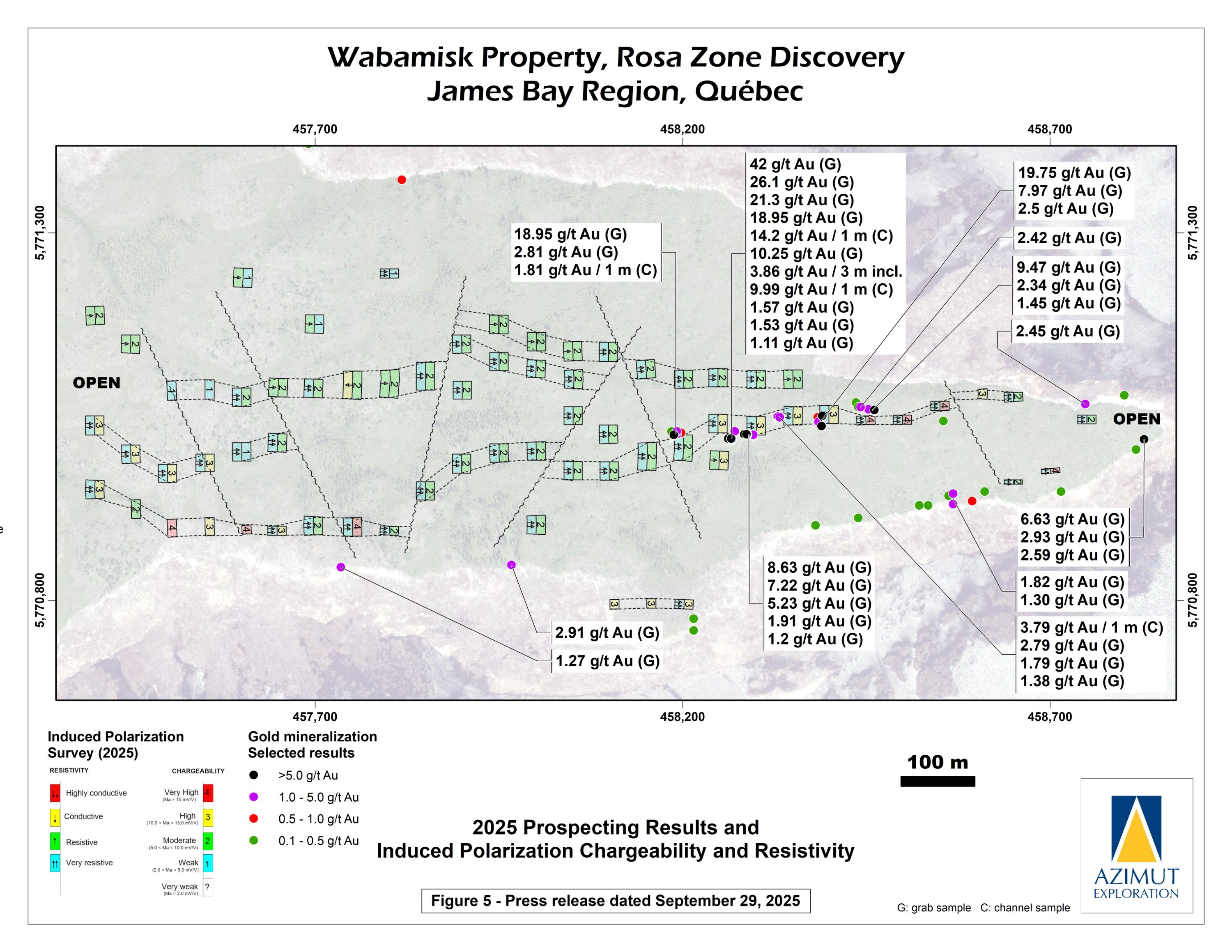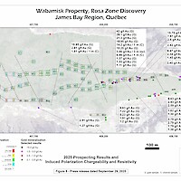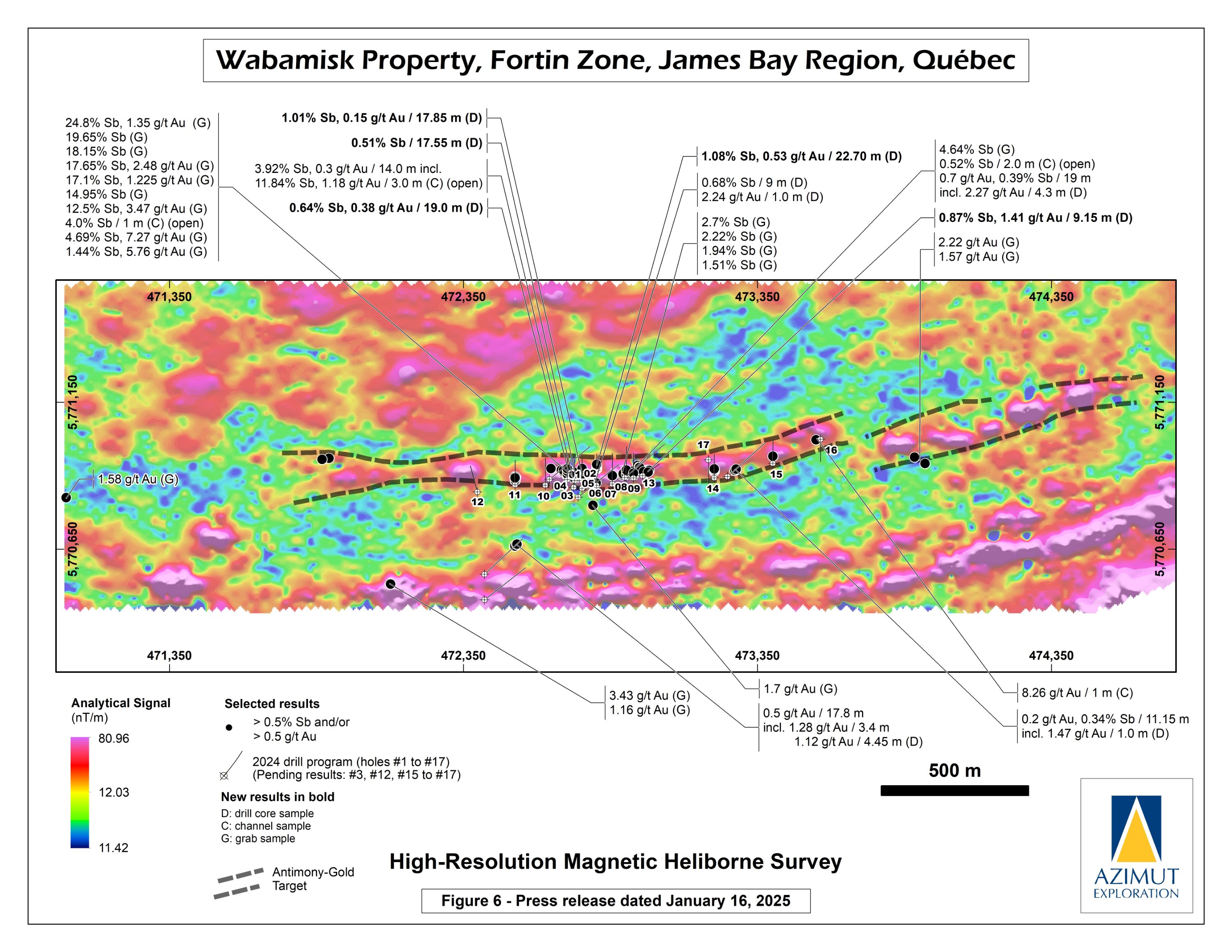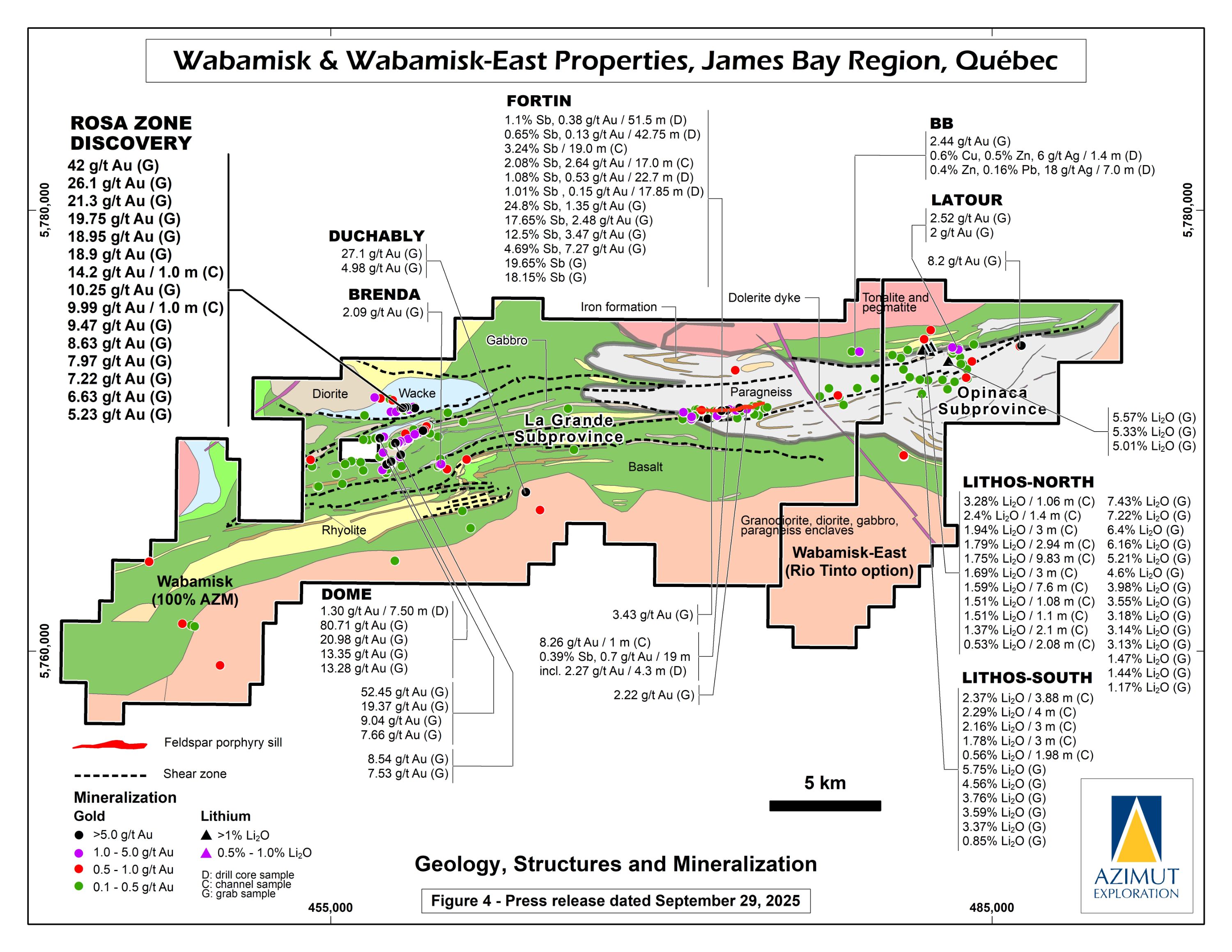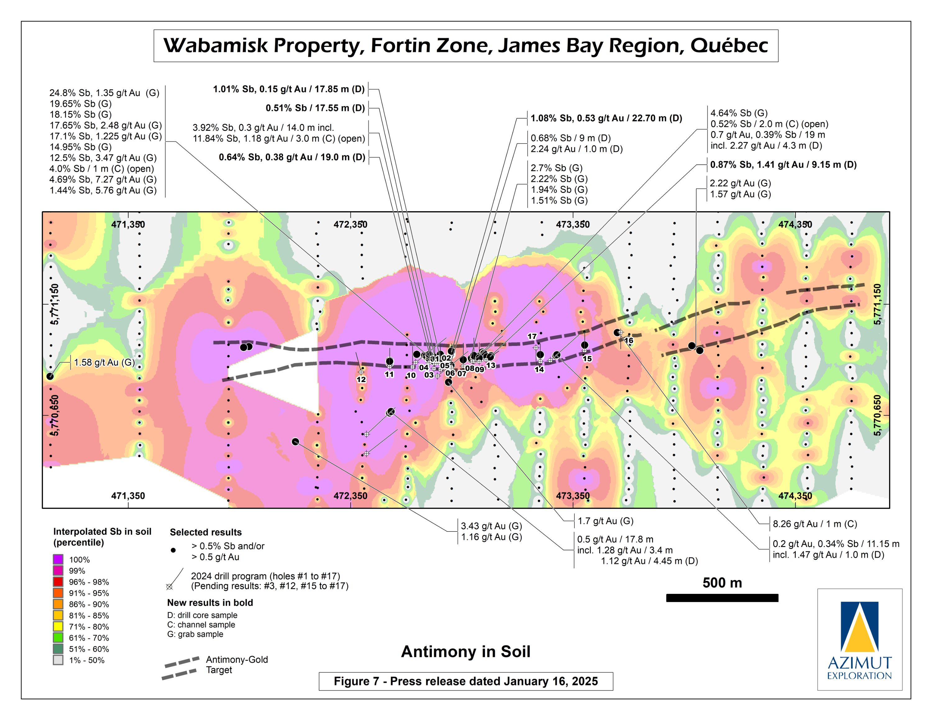 In October 2024, Azimut announced the discovery of a high-grade antimony corridor on the property with channel samples (3.92% Sb over 14.0 m) and numerous high-grade grab samples (up to 24.8% Sb) collected along a 1.2-kilometre-long strike within the Fortin Zone. Gold (up to 7.27 g/t Au in grabs) commonly accompanies antimony. Note that grab samples are selective by nature and unlikely to represent average grades. Geoscientific data (prospecting, induced polarization and magnetism, lake sediment, till and soil geochemistry) support a minimum 3.5-kilometre length for the antimony-gold exploration corridor. Significant additional work is needed to appraise its full potential.