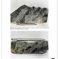 At the outcrop scale, the mineralized zone overlaps a contact between felsic tuffs and/or a porphyritic quartz diorite sill and sheared metasediments (siltstone). The highest-grade antimony samples (above 10% Sb) seem preferentially hosted in metasediments.