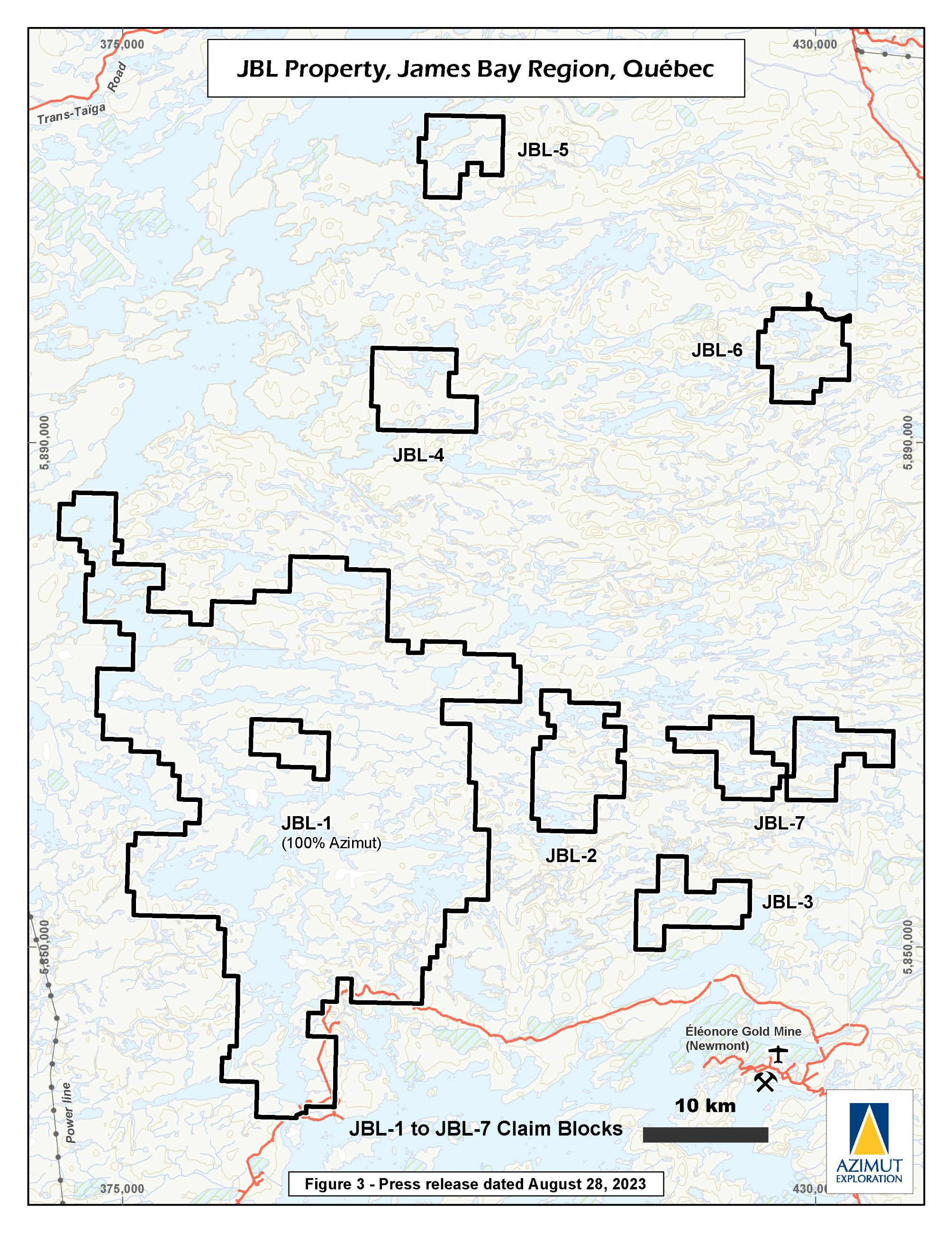 In late 2022, Azimut’s completed a lithium potential assessment at the scale of the James Bay region, which identified multiple prospective lithium targets with even stronger footprints than known lithium deposits in the region. The Company acquired thirteen claim blocks by map designation to cover these unexplored targets, collectively forming the James Bay Lithium (“JBL”) Project (PR of January 23, 2023). All but one of the blocks lie within 75 km to the south of the Trans-Taiga Road, and 6 of these, including the largest claim block, are close to Newmont’s Eleonore mine. Lithium is considered a critical commodity by the Quebec and Canadian governments for economic security and the transition to a low-carbon economy.