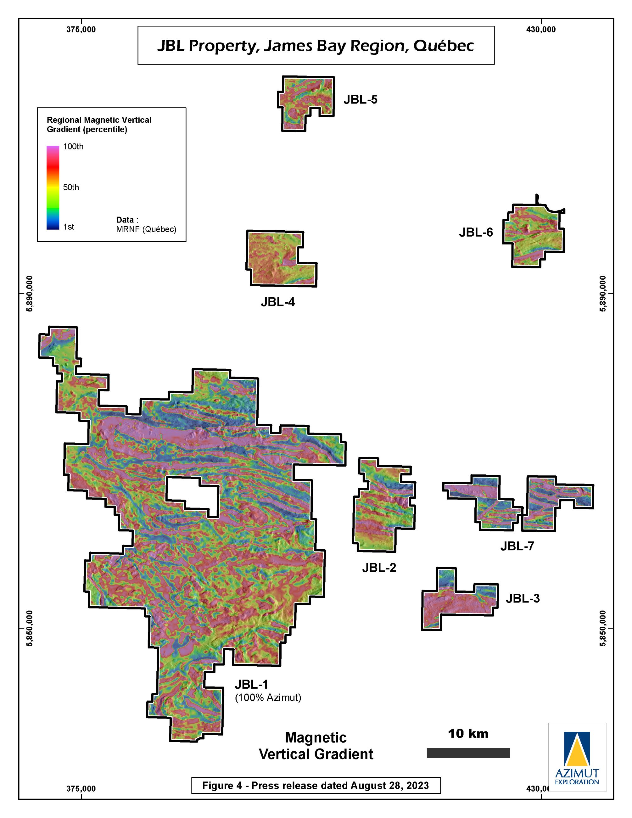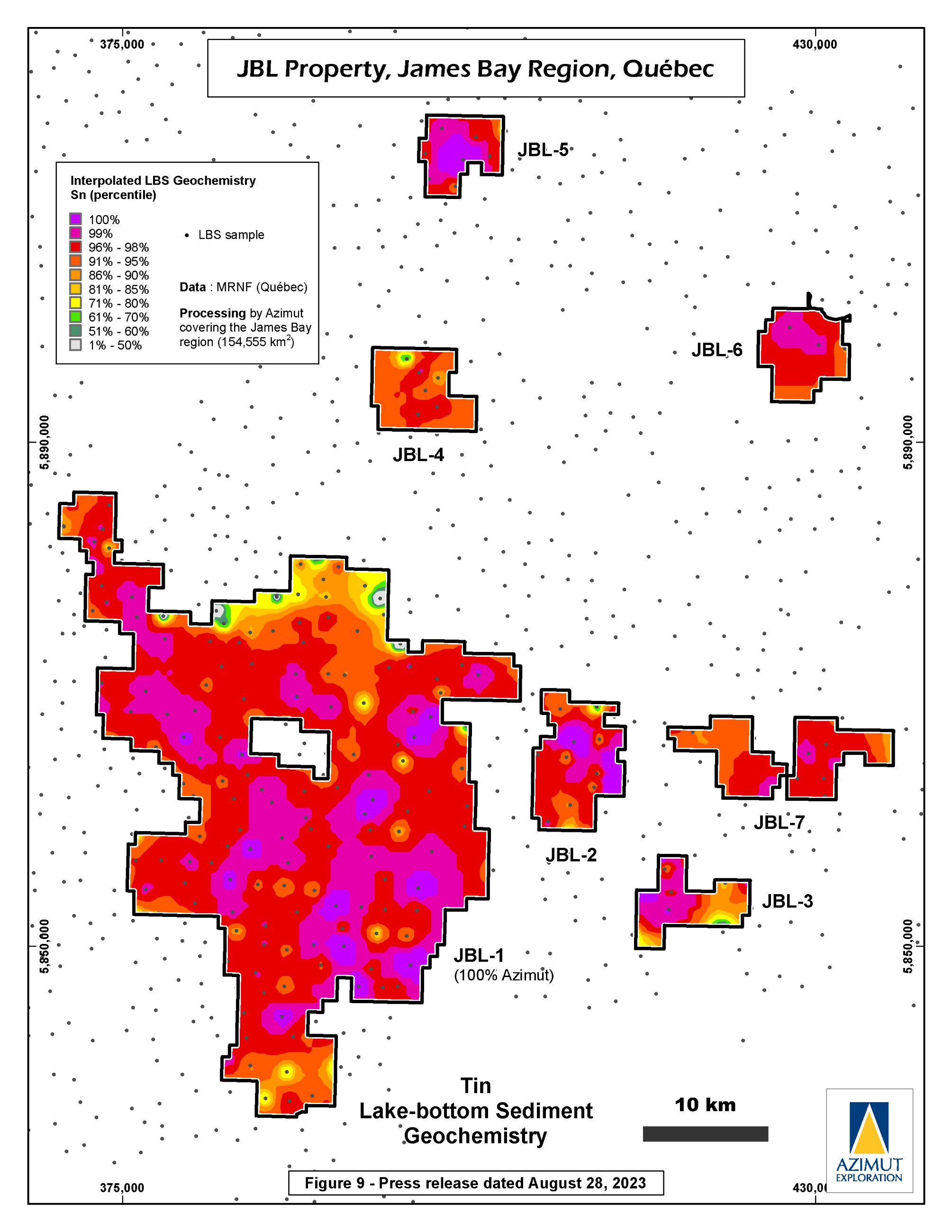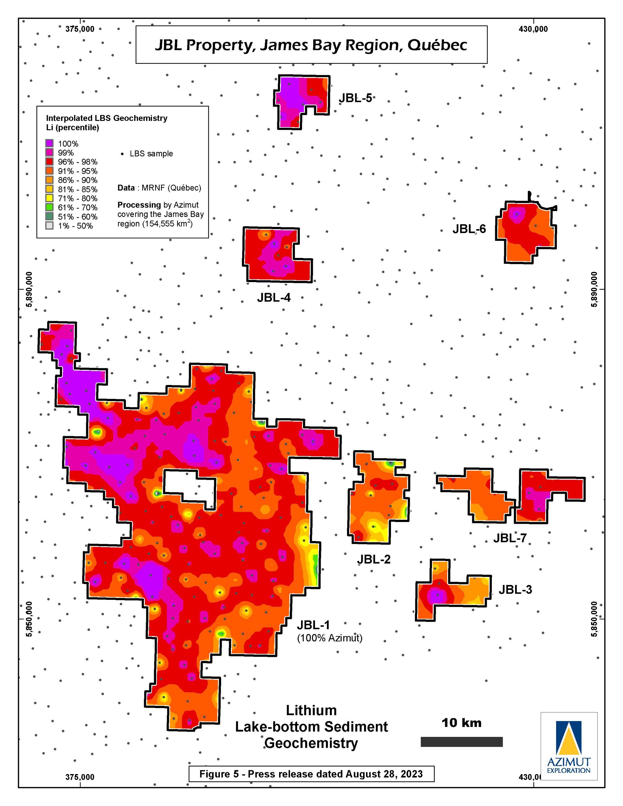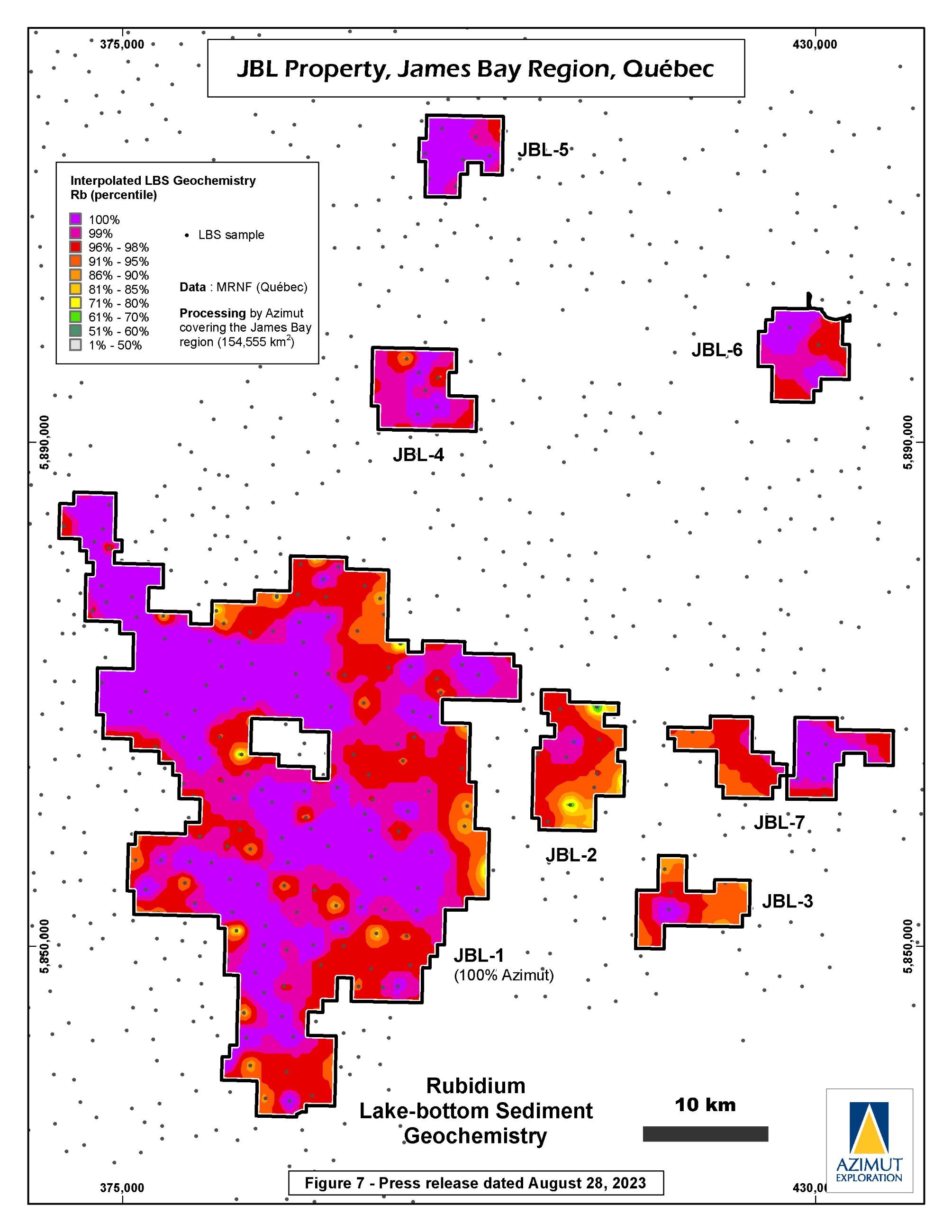 The JBL Project covers strong regional Li, Cs, Rb, Ga and Sn anomalies in lake-bottom sediment that may reveal significant spodumene-bearing pegmatite bodies in close vicinity (classically at kilometre-scale or less). The claim blocks can be efficiently assessed using exploration protocols already implemented by Azimut at the scale of the James Bay region, notably through in-fill lake-bottom sediment surveys, advanced data processing and prospecting.