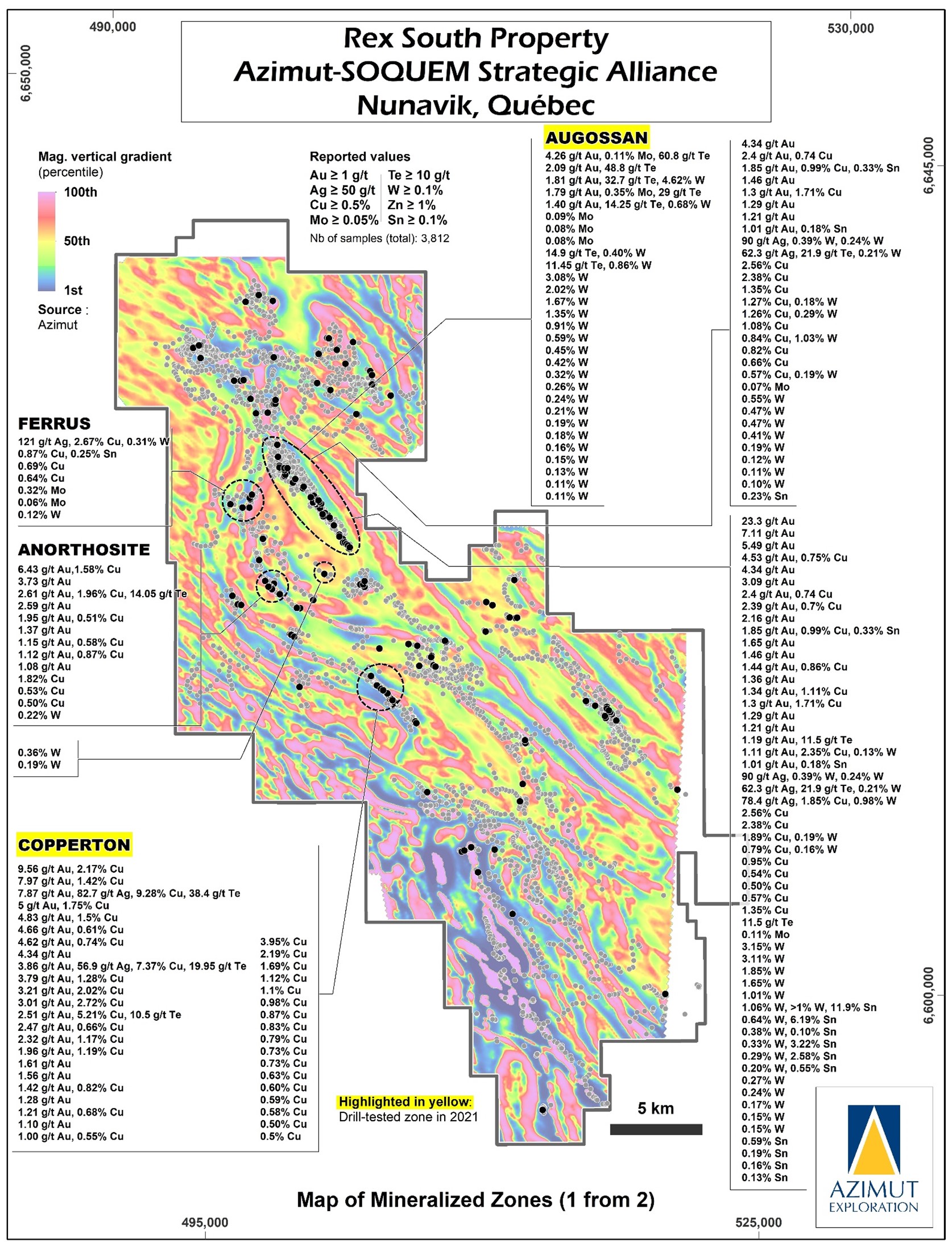 Azimut and Aurizon re-evaluate tungsten values on the Copper-Gold Augossan Zone at Rex South, Nunavik, Quebec