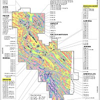 The Dragon North target zone, 450 m long by 90 m wide, is hosted in foliated mafic and felsic volcanics striking NW and dipping to the NE. Mineralization is mainly chalcopyrite accompanied by lesser pyrite and magnetite. The best grab samples are 4.05% Cu, 0.6% Mo and 2.78% Cu, 0.13% Mo. Alteration is mainly silicification.