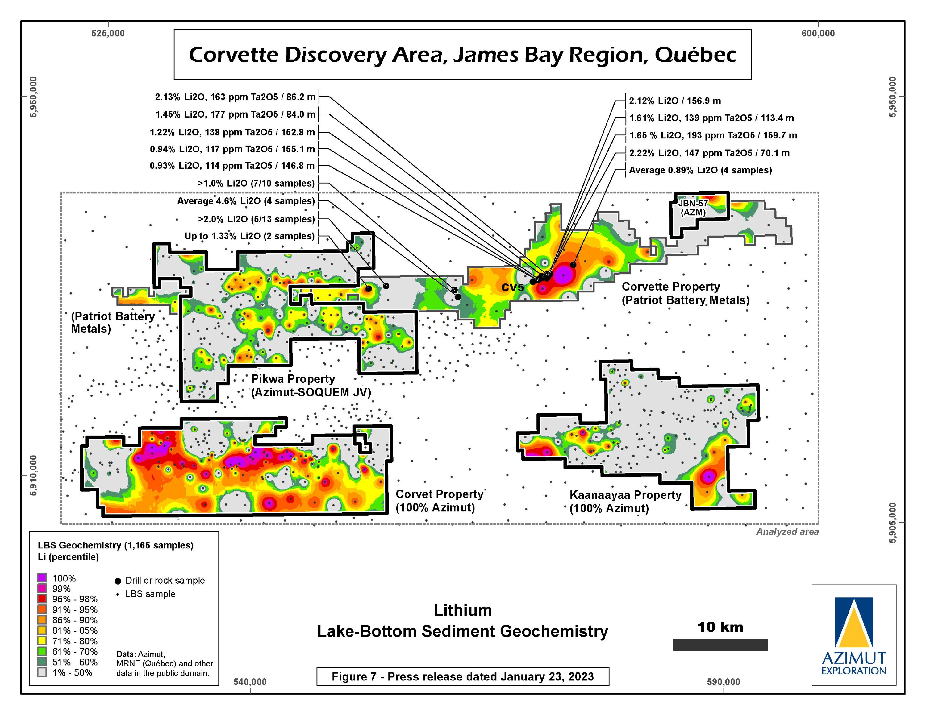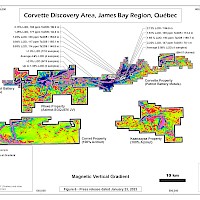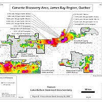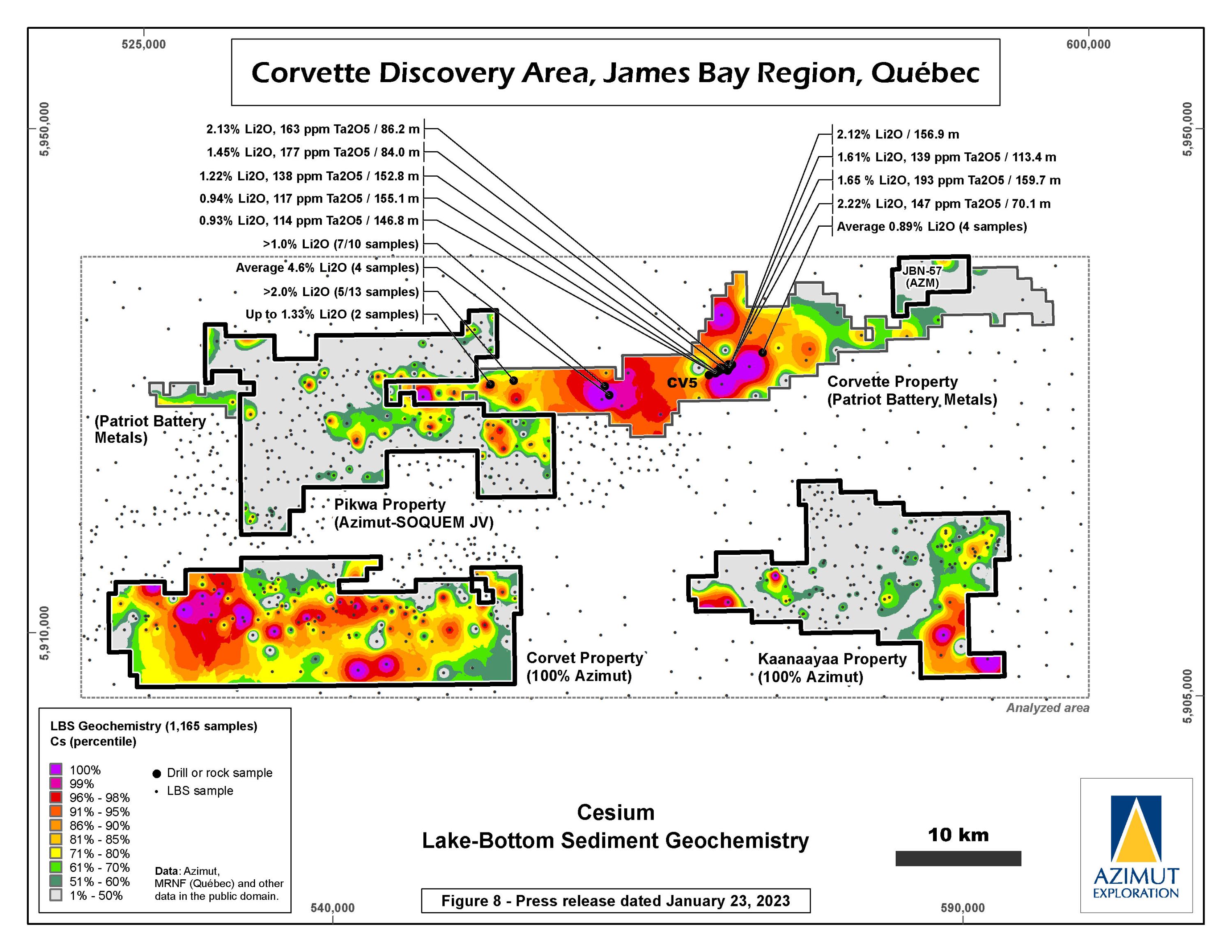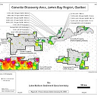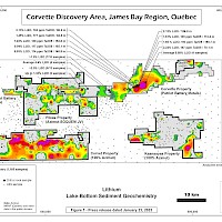 The Corvet property lies immediately south of the Company’s Pikwa property, near the Trans-Taiga Road, a nearly 600-km-long gravel highway running east-west through the James Bay region. It is 55 km southwest of the La Grande-4 airstrip and 225 km east-southeast of Radisson. The property straddles a major tectonic boundary and displays a strong multi-element (Ag-As-Bi-Cu-Sb) spatial association in lake-bottom sediments. The property also covers an outstanding lithium exploration target represented by a prominent 26-km-long Li anomaly in lake-bottom sediment coupled with strong Rb, Cs, Ga and Sn footprints. The property occupies a strategic location relative to the emerging Corvette (Patriot Battery Metals) lithium district.