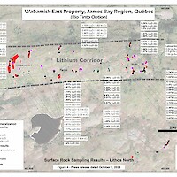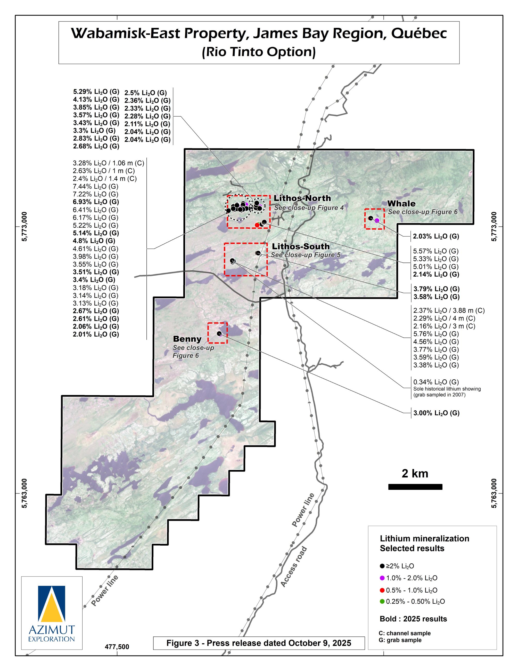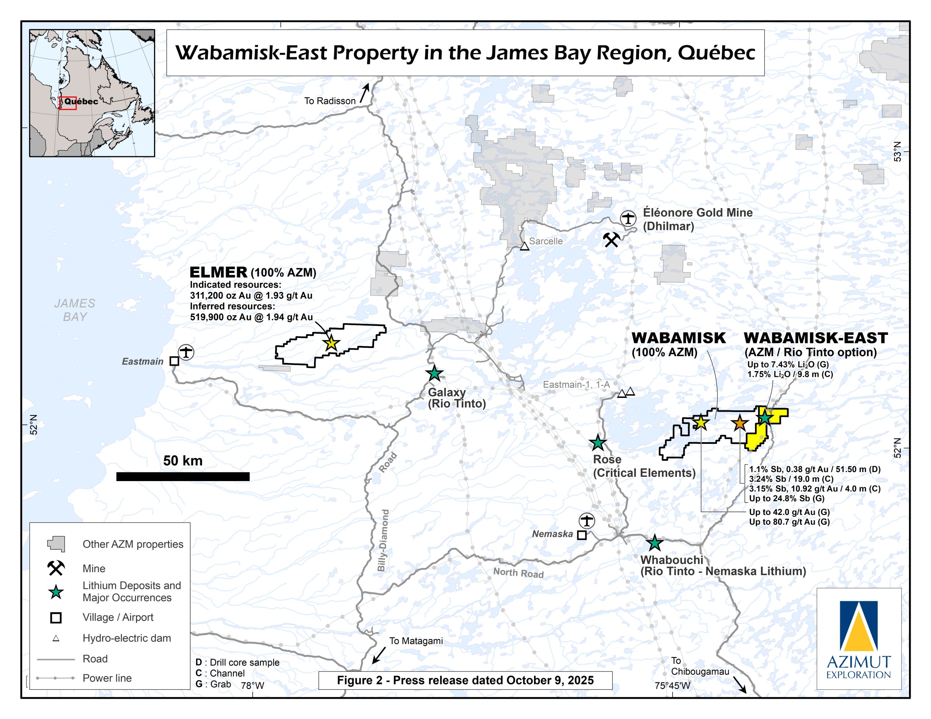 The newly formed Wabamisk East property corresponds to the eastern part of Azimut’s wholly owned Wabamisk property and is located 42 km northeast of the Whabouchi property (Nemaska Lithium Inc.). Major powerlines pass through or close to the property's eastern end, and the North Road highway passes 37 km to the south. The nearest town is Nemaska, a Cree community, 55 km to the southeast.