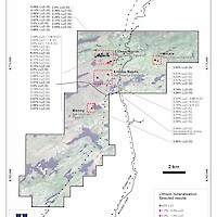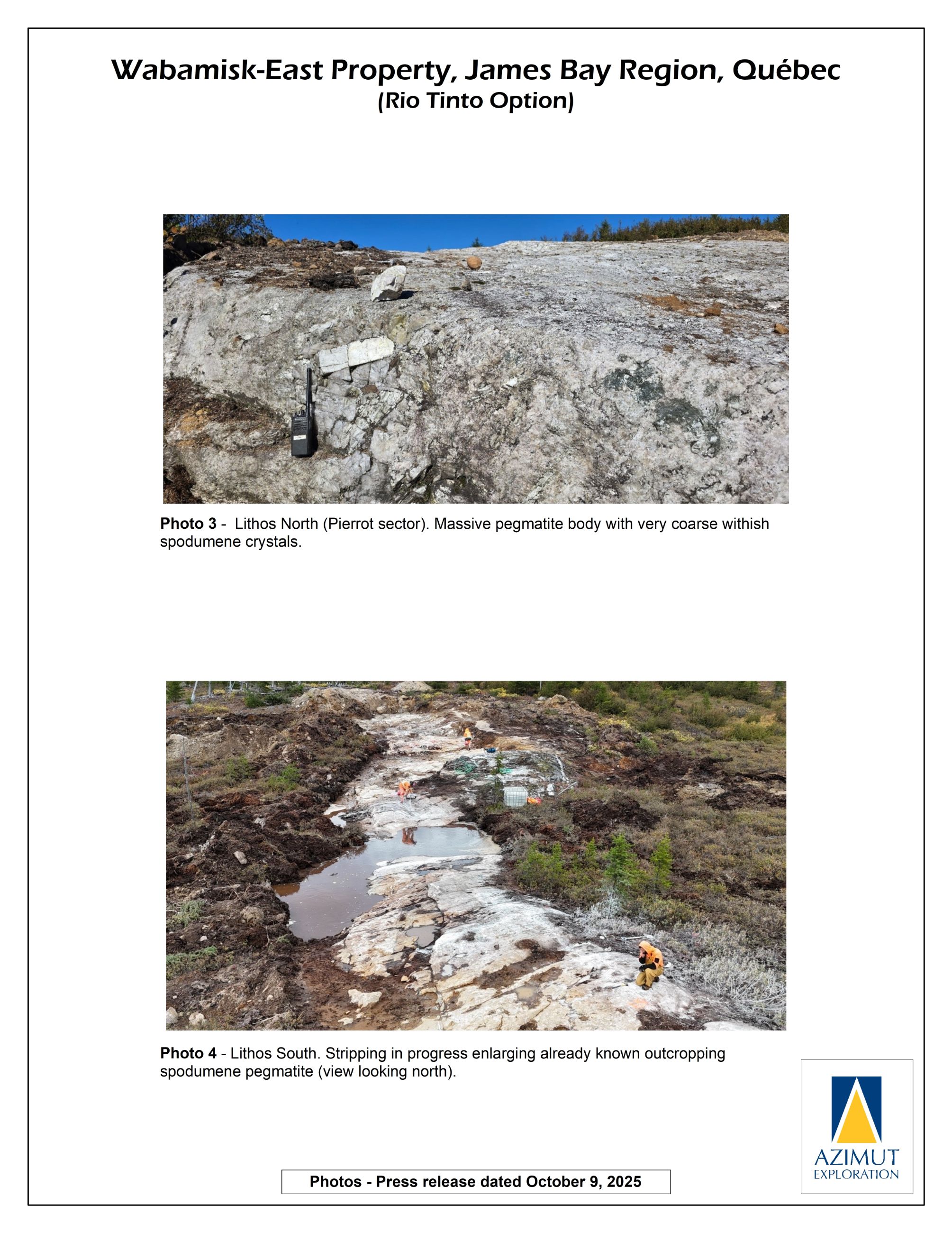 Since regaining full control of the Property, Azimut reprocessed the property’s large database to rank exploration targets. The 2024 prospecting program revealed an antimony-rich system but also a strong potential for lithium, with an extensive spodumene pegmatite field identified.